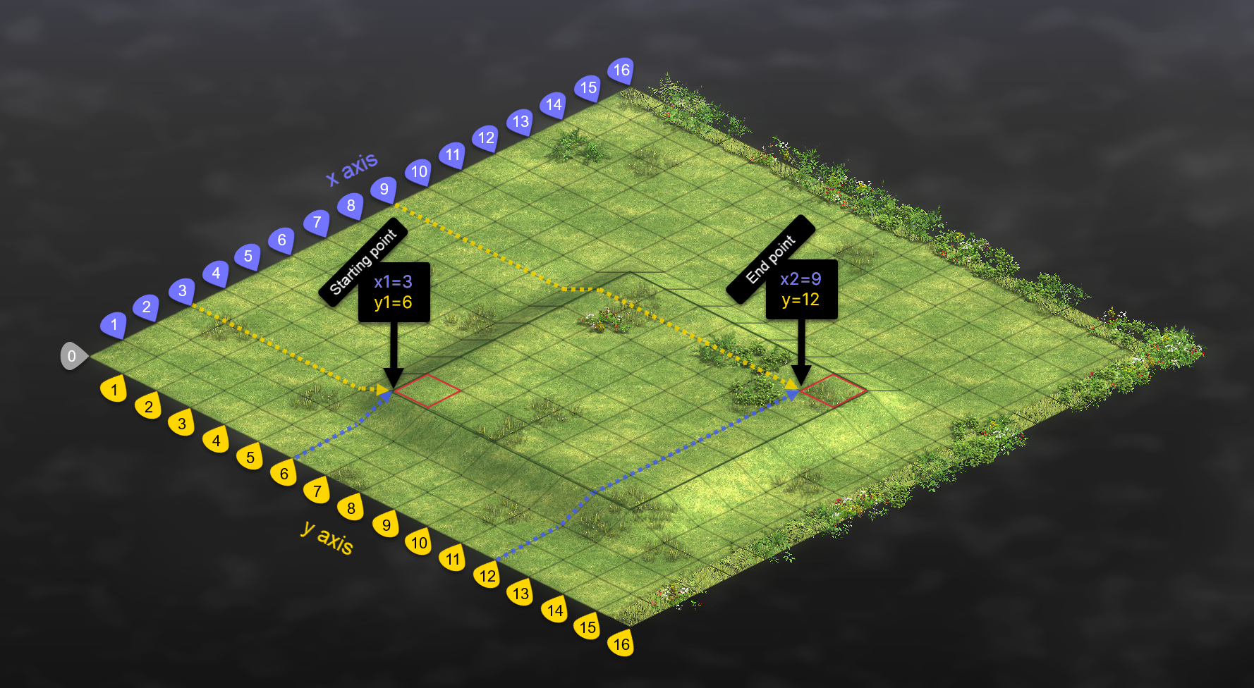 elevation=6in the parser. This is becauseelevation=0is elevation 1 in the editor. Using the parser you can go as large as you want, though the game can bug out if you go above 20.Below is a graphic explaining how the map coordinates work: